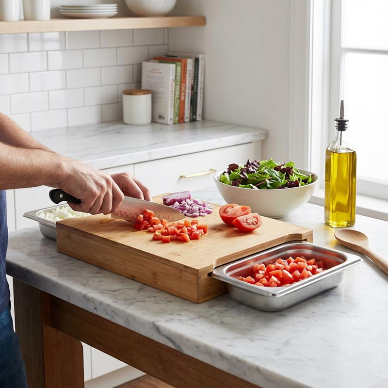 Unser hochwertiges, standsicheres Schneidebrett aus Bambus inklusive 2 herausziehbaren GN 1/4 Behältern vereint durchdachtes Design, Nachhaltigkeit und maximale Funktionalität – ideal für den privaten Haushalt sowie für die Gastronomie.Dank seines nachhaltigen Materials überzeugt das Schneidebrett nicht nur durch Funktionalität, sondern auch durch Umweltbewusstsein: Bambus ist besonders umweltfreundlich, pflegeleicht und besitzt von Natur aus antibakterielle Eigenschaften. Mithilfe der zwei integrierten Auffangwannen unterhalb des Schneidebretts können die geschnittenen Lebensmittel oder auch die Abfallreste sauber aufgefangen und sortiert werden. Die GN-Behälter werden wie eine Schublade herausgeschoben und können mit nur einem Handgriff entleert werden.