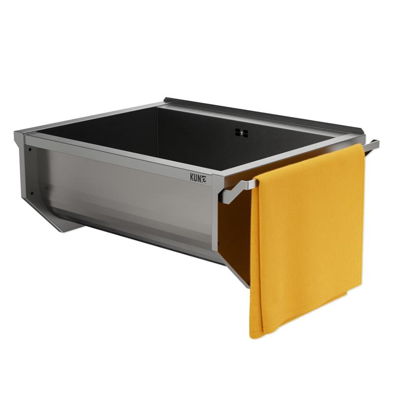 Der Handtuchhalter ist die perfekte Ergänzung für Ihr Ausgussbecken der Serie SOLIDUM oder SOLIDUM Plus. Gefertigt aus hochwertigem Chrom-Nickelstahl (Werkstoffnummer 1.4301) überzeugt er durch seine langlebige, robuste Ausführung und eine allseitig gebürstete Oberfläche, die sich harmonisch in das Design der Beckenserie einfügt.